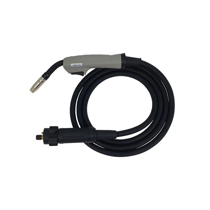 W komplecie znajdują się uchwyt MIG, przewód masowy i przewód elektrodowy.
