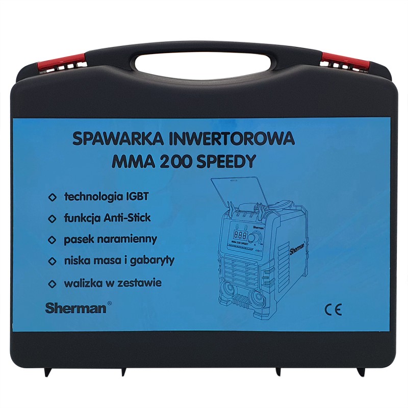 spawarki inwertorowej Sherman mma 200 wyposażona jest także w pasek na ramię o regulowanej długości ułatwiający przenoszenie urządzenia. Całość umieszczona jest w praktycznej walizce ułatwiającej transport urządzenia.