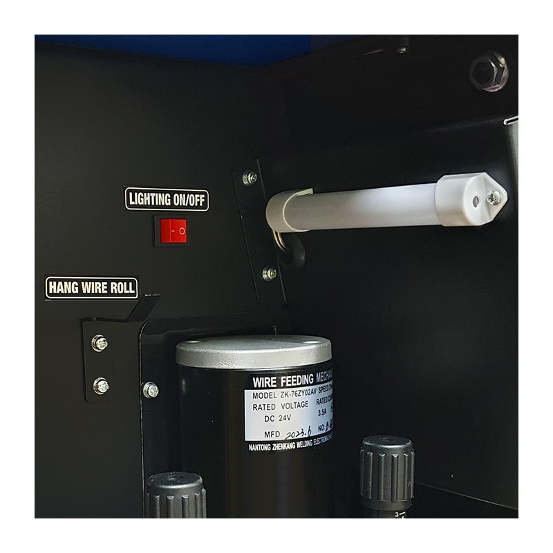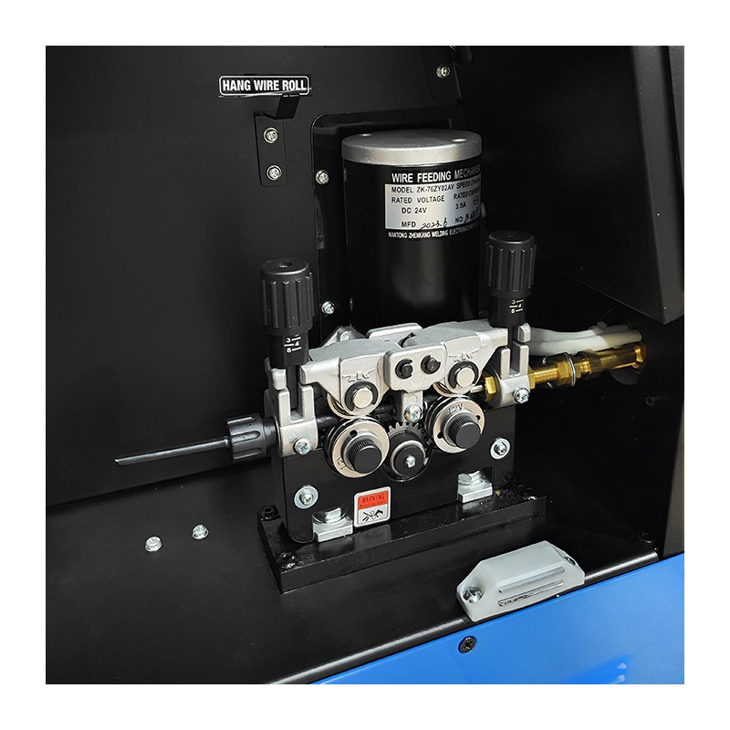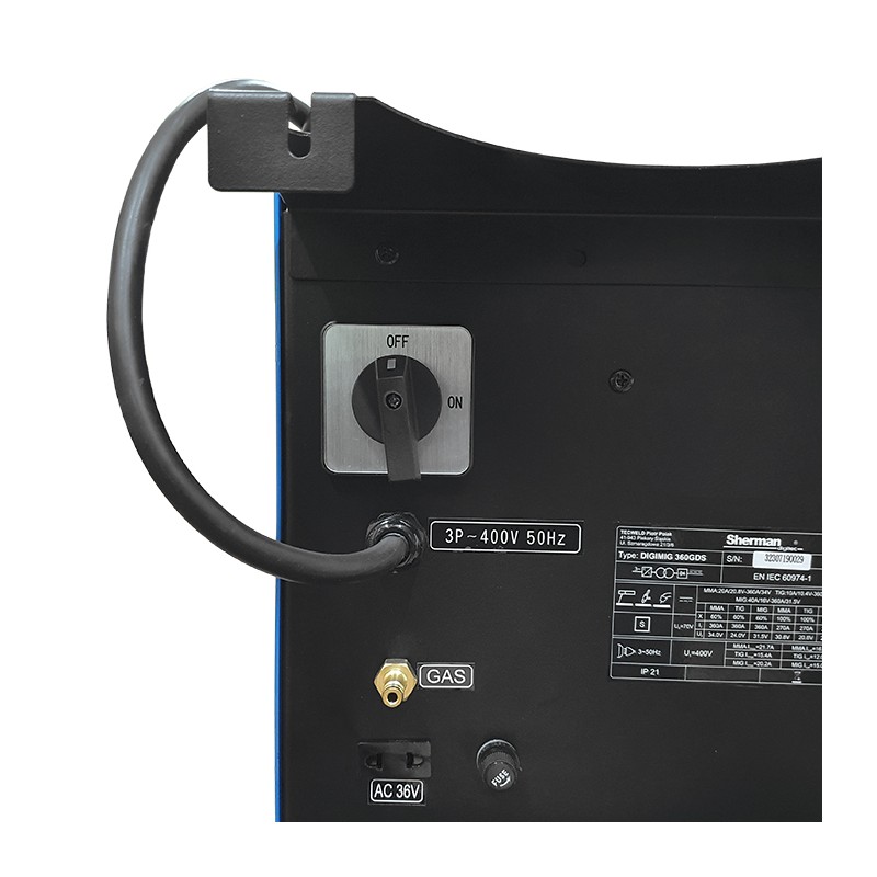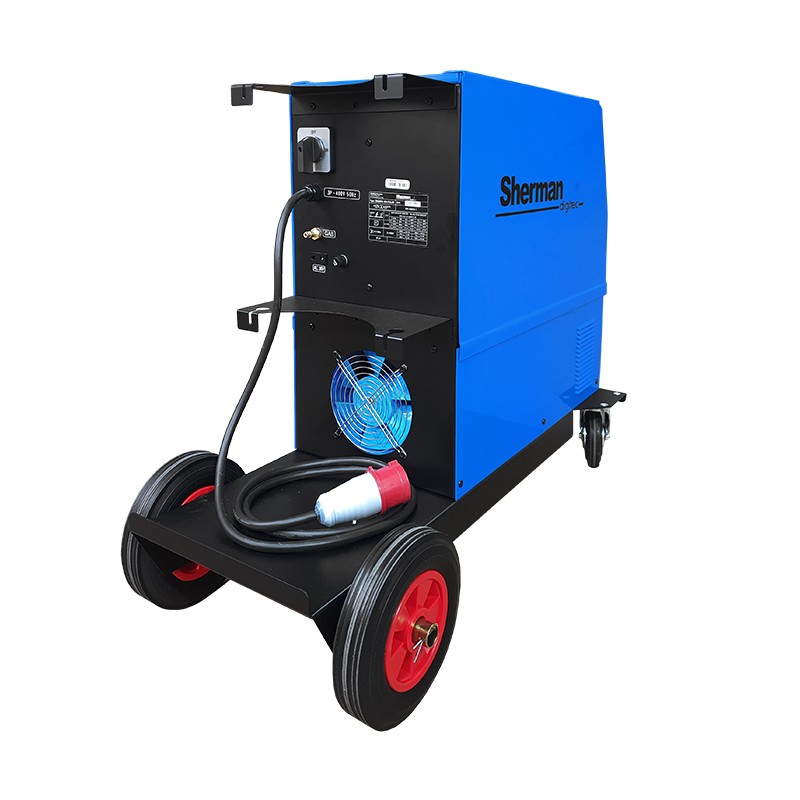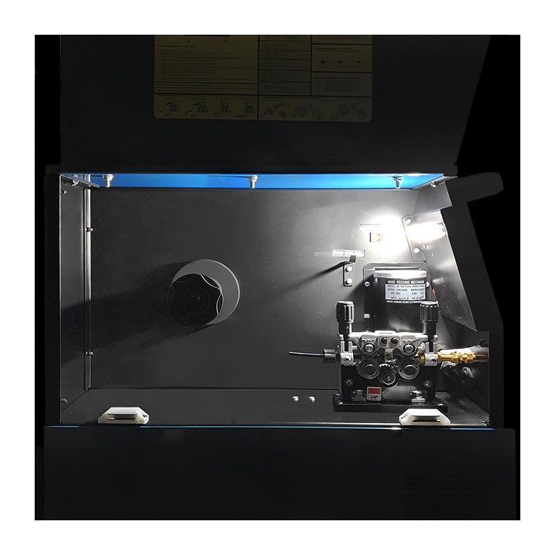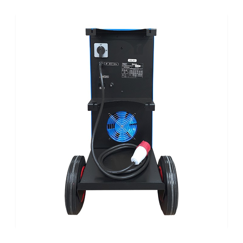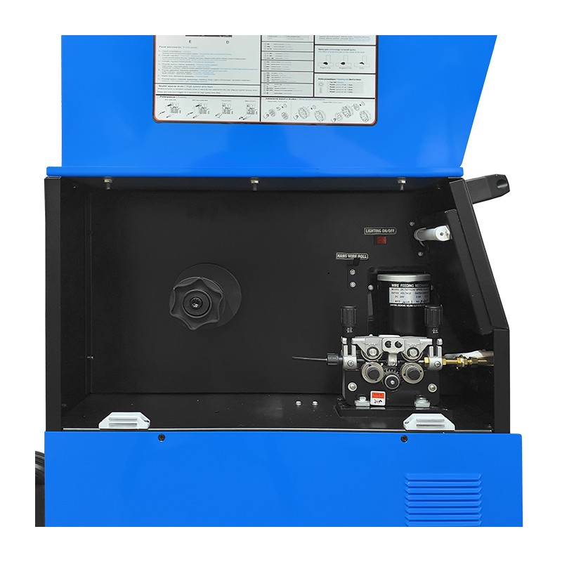 Spawarka może być zasilana zarówno z sieci jednofazowej 230V jak i sieci trójfazowej 3x400V. Wykrywanie napięcia zasilania następuje automatycznie, urządzenie wyposażone jest w przejściówkę kablową. Wyposażona jest w profesjonalny 4-rolkowy podajnik drutu z płynną regulacją prędkości posuwu. Posiada również płynną regulację napięcia spawania przy spawaniu metodą MIG/MAG, oraz prądu spawania przy metodzie MMA. Urządzenie wyposażone jest w regulację opóźnienia wypływu gazu, przełącznik 2T/4T oraz regulację indukcyjności przydatną przy spawaniu cienkich blach. Przed przeciążeniem chroni je zabezpieczenie termiczne. Współpracuje ze szpulami drutu K-200 (5kg) oraz K-300 (15) kg.