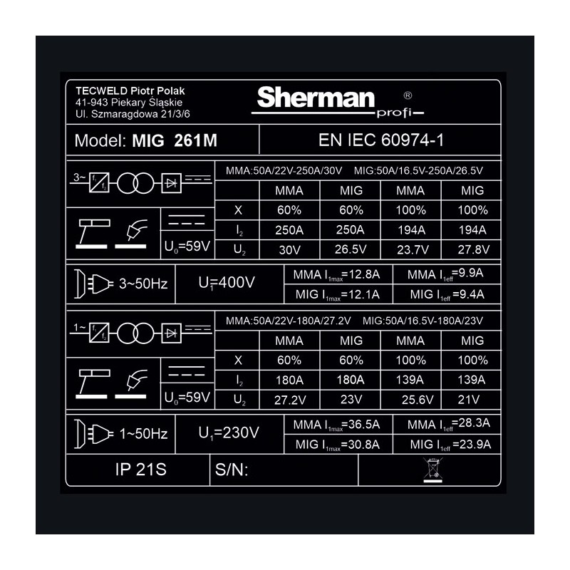 Inwertorowa, MIG, 250A (60%), AC 3x400V 50Hz. Wyposażenie: uchwyt spawalniczy TW-25/4m, uchwyt masowy, uchwyt elektrodowy.