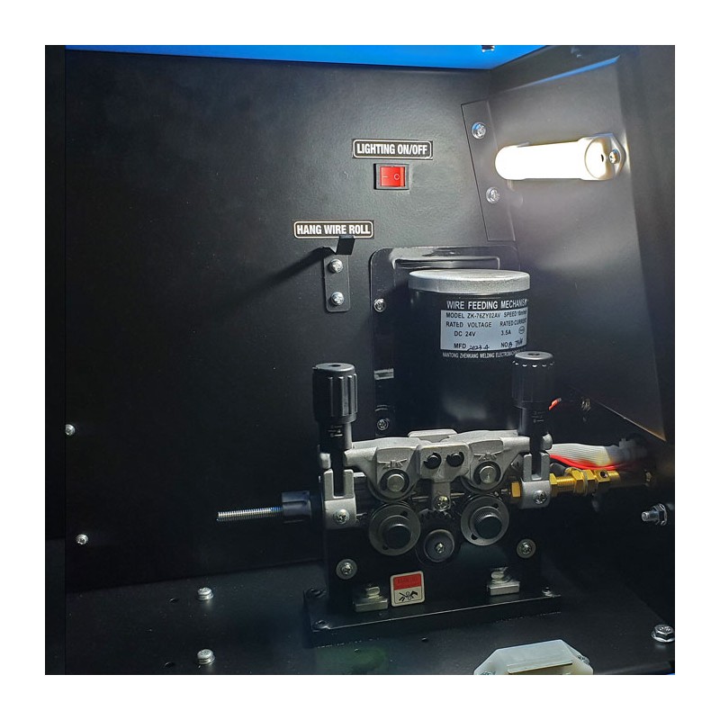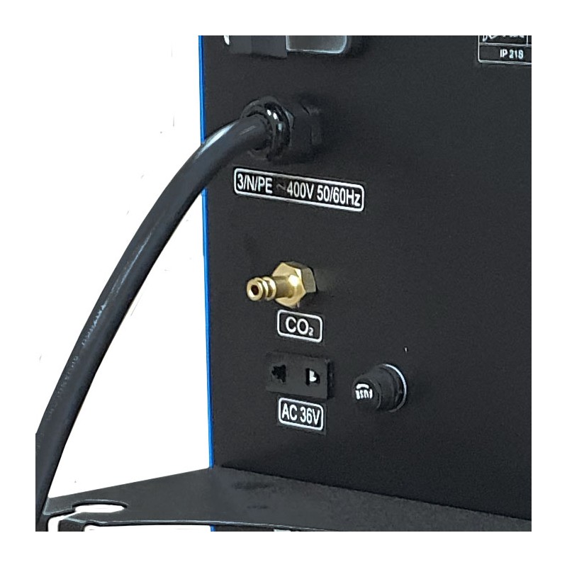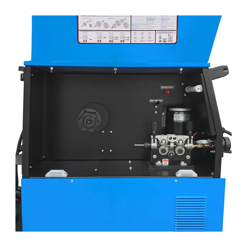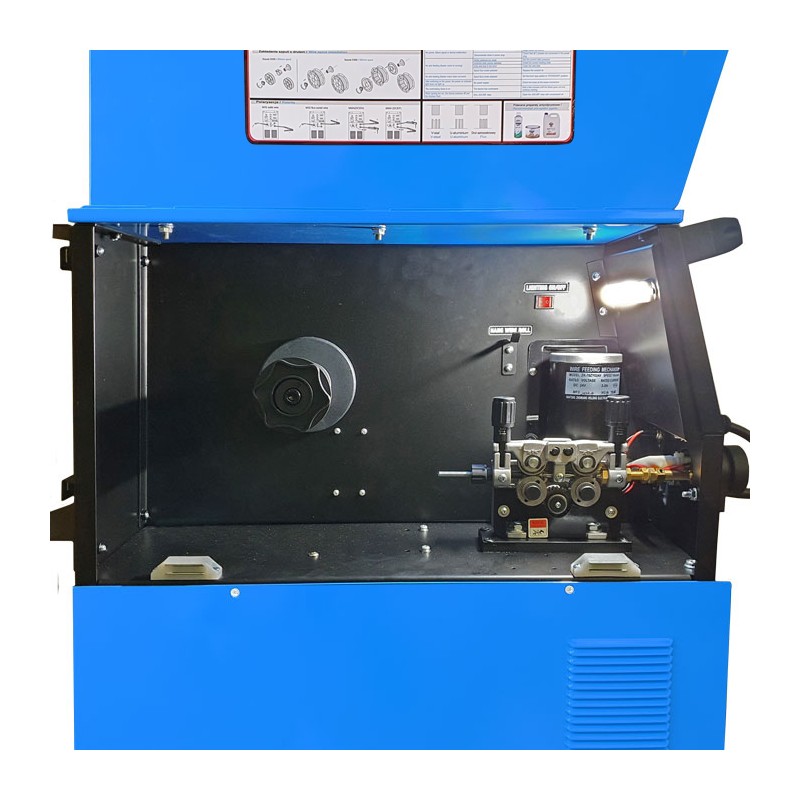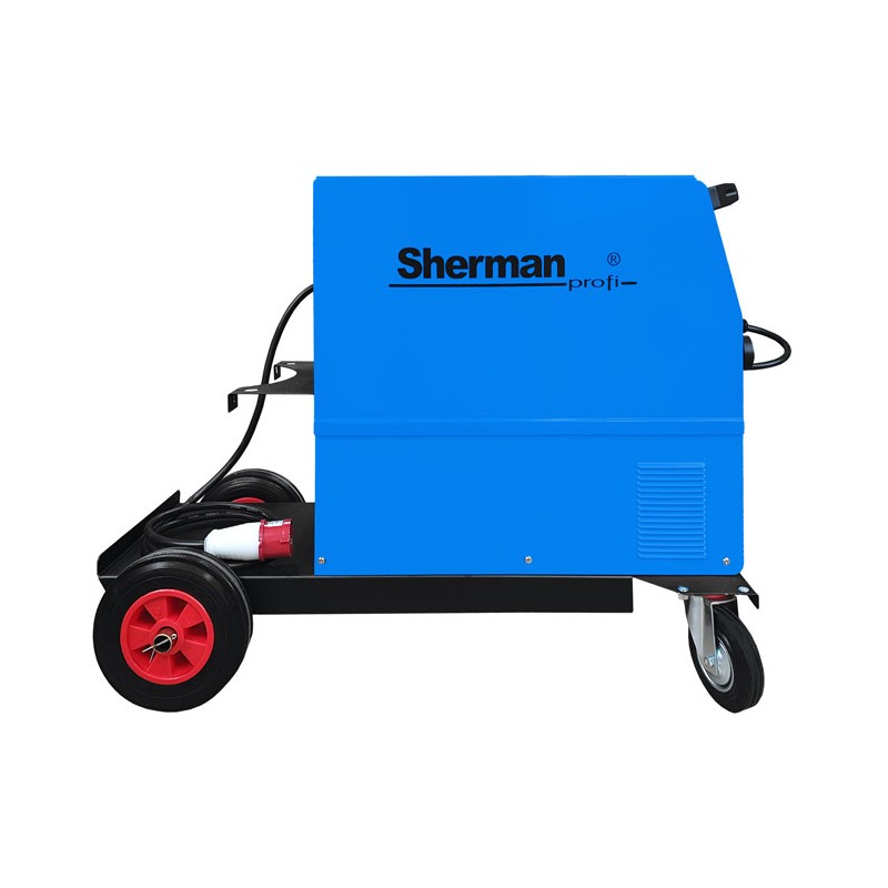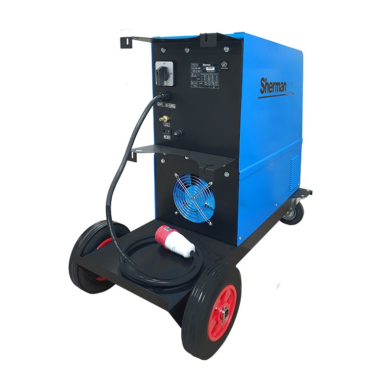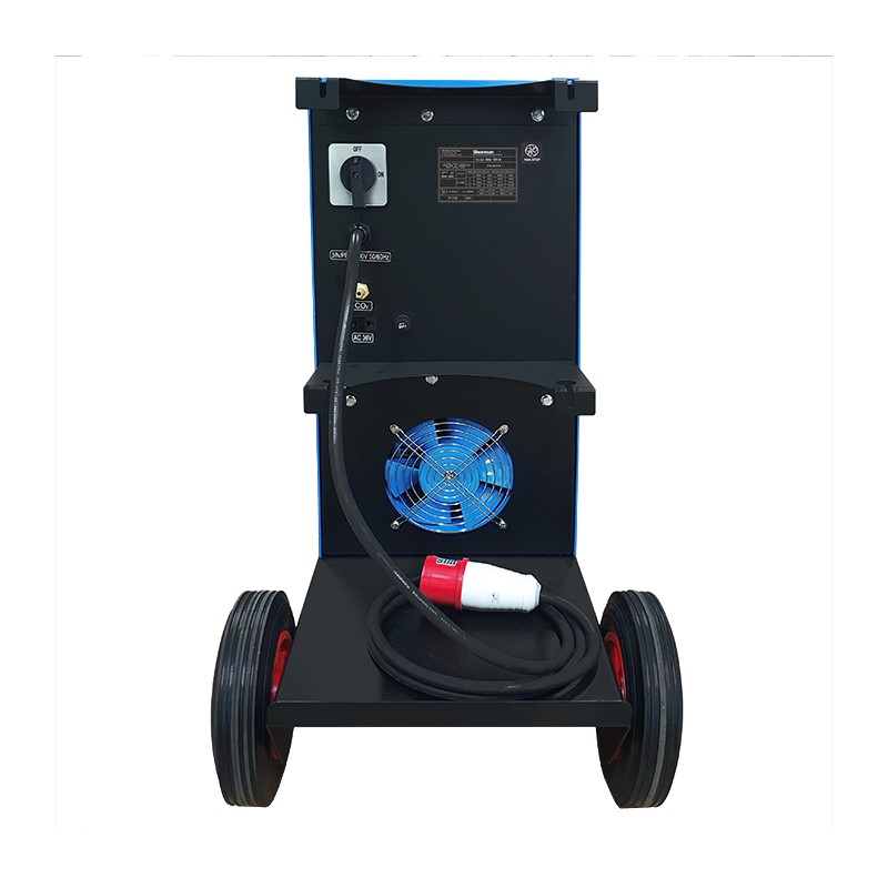 Urządzenie zasilane jest napięciem trójfazowym 3x400V. Wyposażony jest w profesjonalny 4-rolkowy podajnik drutu z płynną regulacją prędkości posuwu. Posiada również płynną regulację napięcia spawania przy spawaniu metodą MIG/MAG, oraz prądu spawania przy metodzie MMA. Urządzenia wyposażone są w regulację opóźnienia wypływu gazu, przełącznik 2T/4T oraz regulację indukcyjności przydatną przy spawaniu cienkich blach. Przed przeciążeniem chroni je zabezpieczenie termiczne. Współpracuje ze szpulami drutu K-200 (5kg) oraz K300 (15) kg.