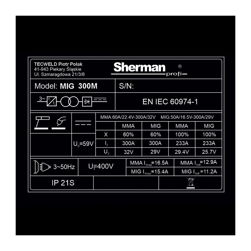 Inwertorowa, MIG, 300A (60%), AC 3x400V 50Hz. Wyposażenie: uchwyt spawalniczy TW-36/4m, uchwyt masowy, uchwyt elektrodowy.
